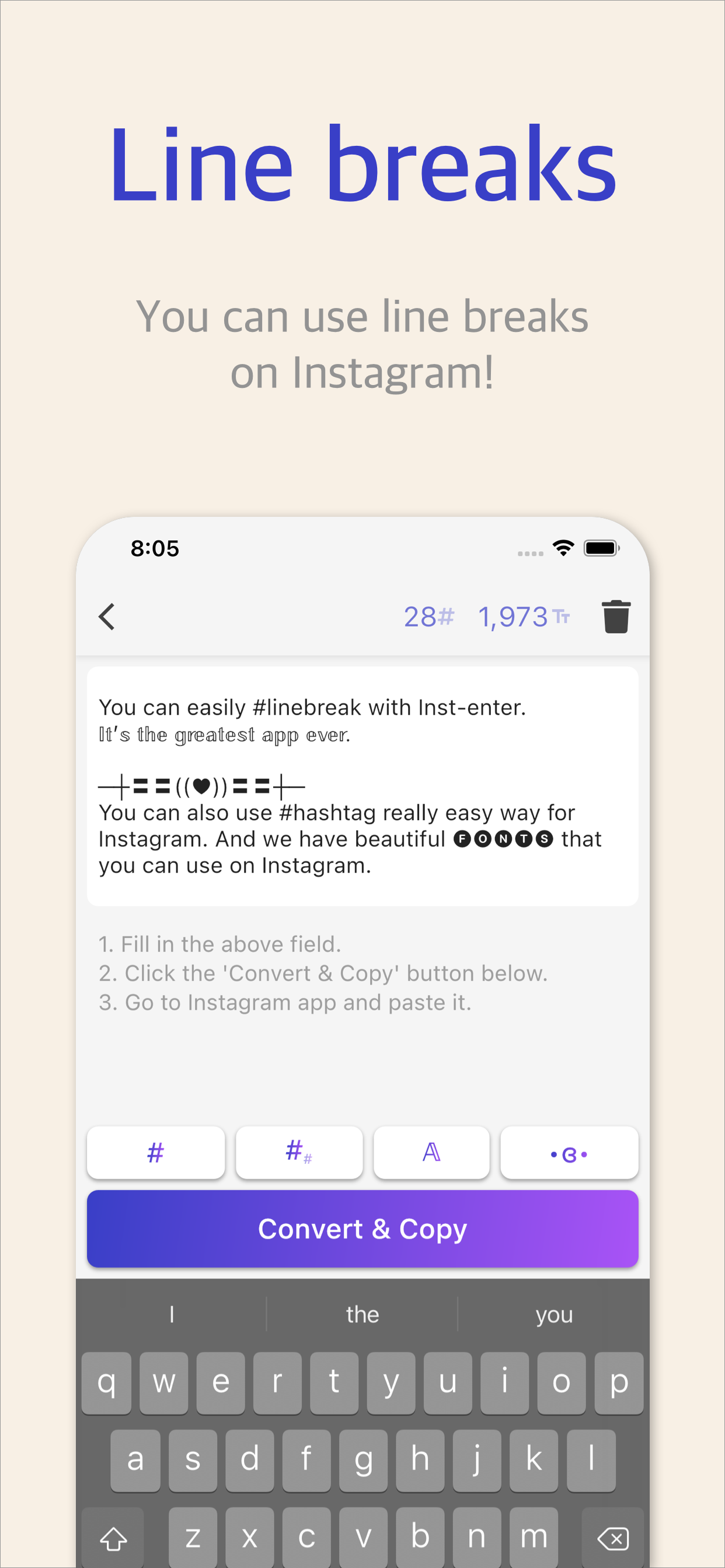 인스타그램 글쓰기를 더 쉽게. 줄바꿈이 유지되는 캡션, 개성 있는 폰트와 이모티콘, 해시태그 그룹 관리까지 한 번에.